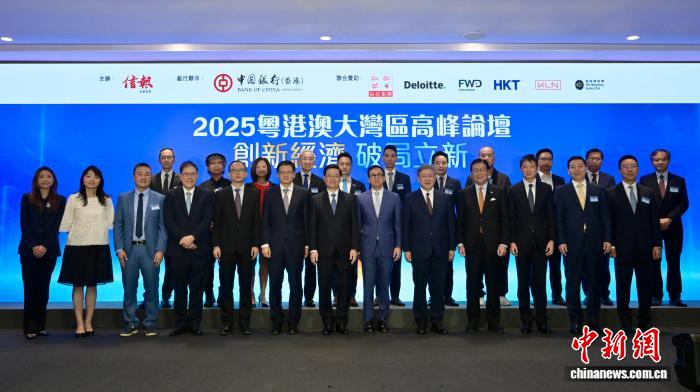 10月16日,由香港经济新闻主办的2025粤港澳大湾区高峰论坛在香港举行。图为香港特别行政区行政长官李家超(前排中)与出席会议的嘉宾。 (香港特别行政区政府新闻处供图)